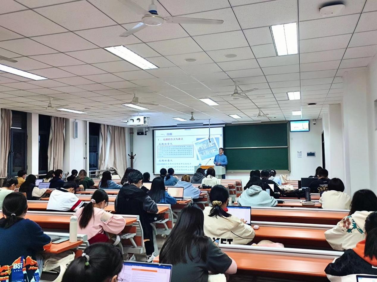 接着,李进涛老师从“获取资料途径”“文献检索步骤”“问卷调查步骤”三个方面论述如何直接或间接收集材料。随后,李进涛老师就“选题意义”“文献综述”“创新点和难点”“研究内容和研究方法”“进度安排”“预期研究成果”六个部分向同学们介绍了“三步走”的最后一步——立项。最后,在提问环节,李进涛老师为同学们进行了答疑。本次指导讲座取得了圆满成功。