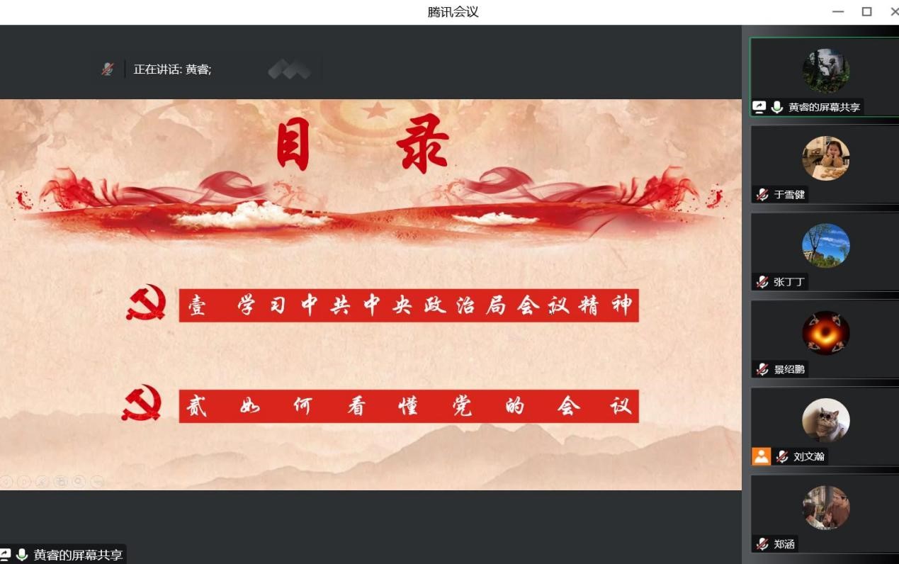 硕士研究生第四党支部书记黄睿进行理论领学,黄睿同志以《如何看懂党的会议》为题,从学习中共中央会议精神、如何看懂党的会议两个方面,带领大家一起梳理党的会议,回顾党的重要会议精神。与会人员结合自身思想认识和生活实际交流了学习体会。大家一致表示要感受初心使命、汲取信仰力量,努力将学习感悟转化为奋斗前行的实际行动。