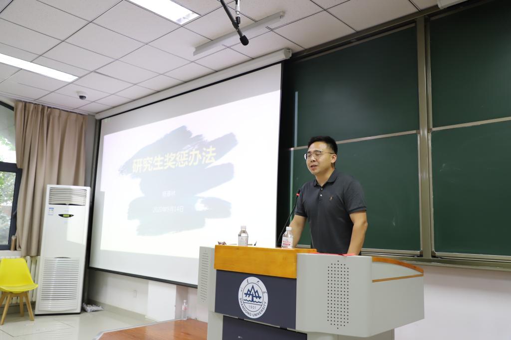 新生辅导员杨春林老师向新生讲解了研究生奖惩办法,从校规校纪、奖学金和助学金体系、对新生的展望与要求三个方面和新生开展沟通交流,激励学生做“有思想的行动者,有才华的好人”。