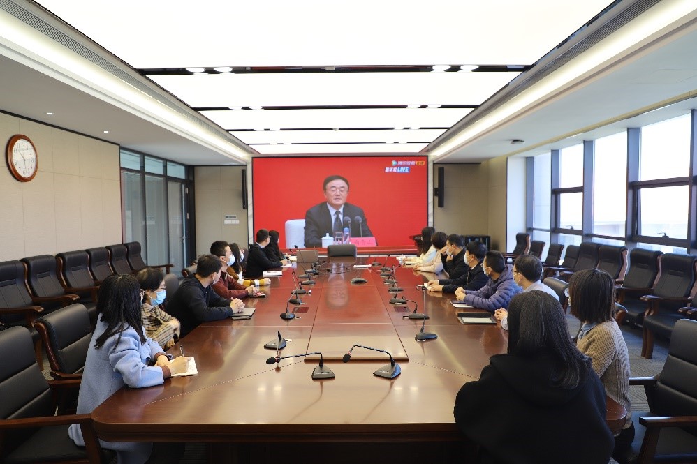 在华岗苑南五楼中厅会议室组织教工集中收看了党的十九届六中全会新闻发布会,同时黄色网站