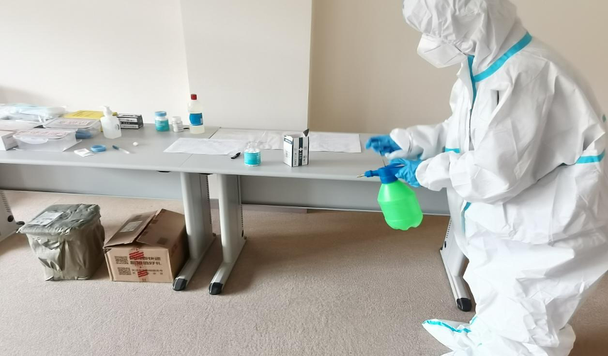 (五)疫情防控联络员返回留观室,用250g/ml消毒液喷洒留观室地面,并用75%酒精擦拭桌面、门把手等物品表面;并将体温异常教工经过的走廊和其办公室一同进行消杀。消杀完毕后,将防护服、口罩、一次性手套等相关废弃医用物品丢入专设的医用口罩垃圾桶。