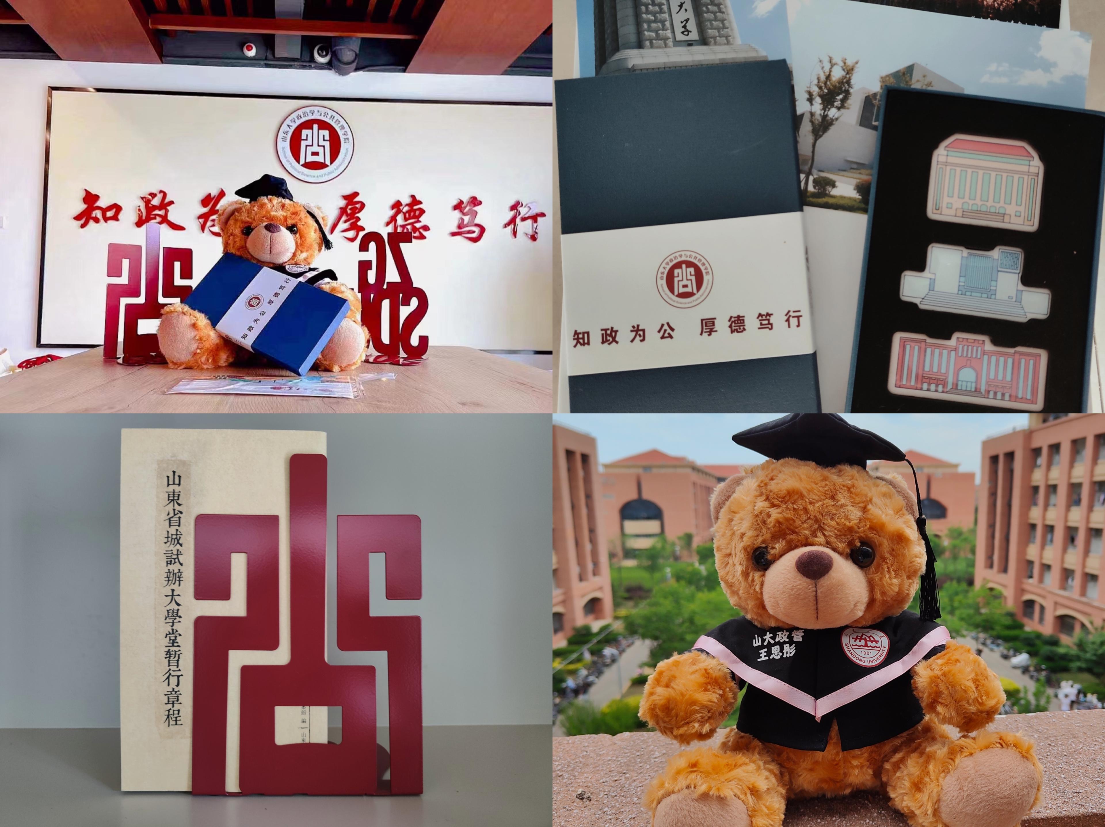传承礼仪之邦的古老传统,特意准备系列纪念品,赠予毕业生,表达深厚的祝福之情。本科毕业生们收到的是一只小毕业熊、一本《山东省城试办大学堂暂行章程》、一套明信片和印有山大标志性建筑的冰箱贴,表达出保持纯真、勿忘母校的美好愿望;一支校友帆布包、一件学士服、一把伞、一个小印章,则表达出对硕士毕业生前途似锦、来日方长的衷心祝愿,毕业并不意味着分别,而是期待下一次更好的相遇。