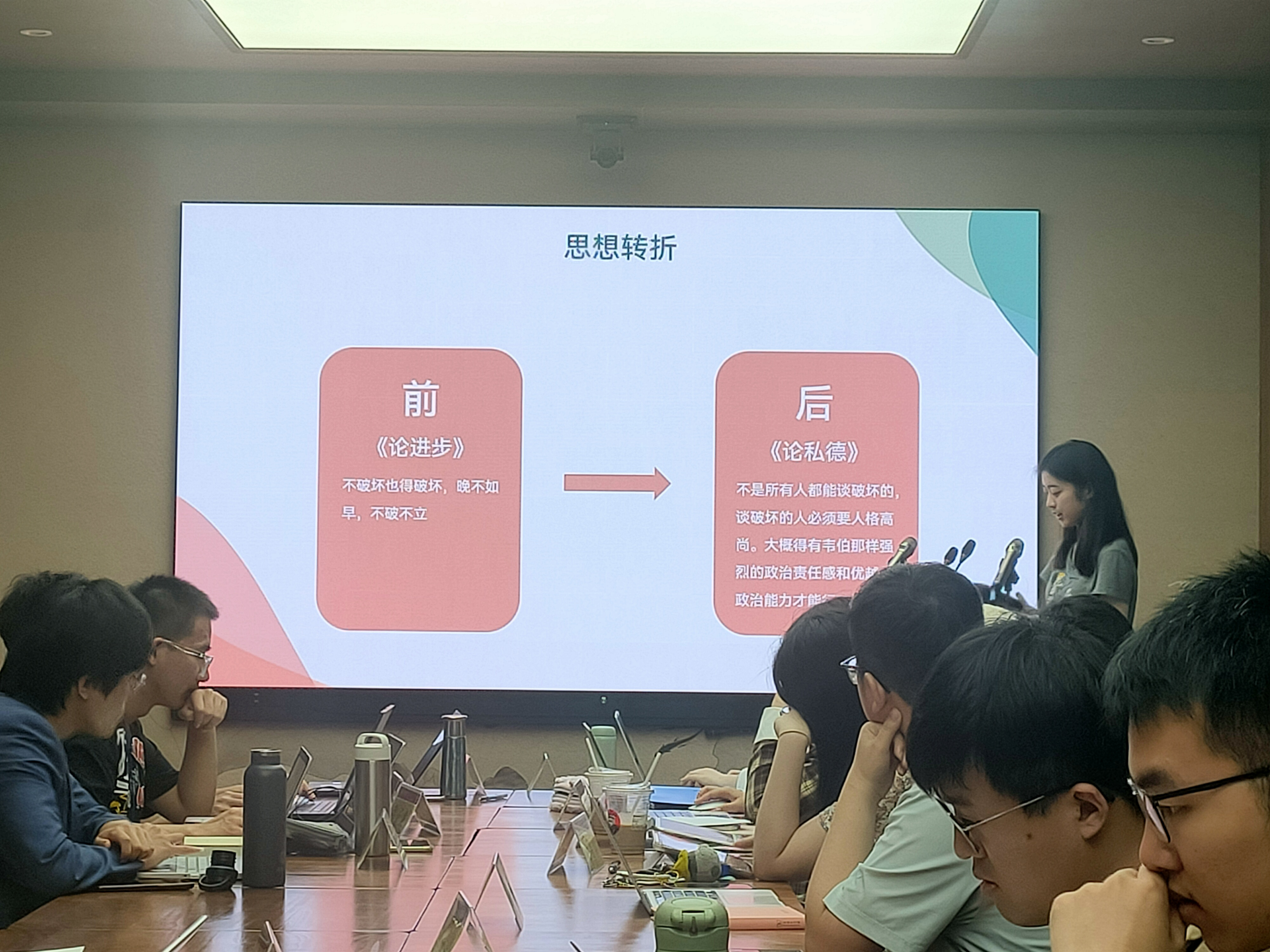 在此次读书会过程中,同学们围绕本期书目展开了主讲、点评与讨论。21级本科生马正伦梳理了《新民说》的主要内容,分析此书的写作背景,并从“变化”这一关键词入手引出了几个思考问题;21级本科生邱思琦主讲《敬告青年》,介绍了此书的写作背景与主要内容,从理论与现实两方面入手带领大家阅读此书。21级本科生王文欣和20级本科生由钊铭就主讲及书目内容进行点评,分享自己的见解。其他参会同学结合主讲人展示内容,围绕文本内容与现实环境等问题也进行了积极讨论。
