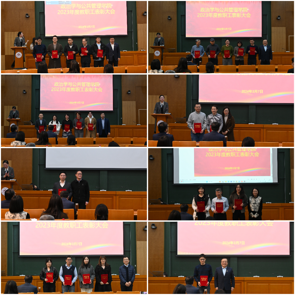 党委副书记石莹主持表彰大会。大会依次颁发了优秀教师奖、优秀共产党员奖、先进教育工作者奖、优秀党务工作者奖、科研突出贡献奖、文体活动突出表现奖、MPA年度优秀教师奖、MPA年度优秀教育工作者奖以及先进基层组织奖。会议强调,全体教工要以先进典型为榜样,凝心聚力,开拓进取,以更加奋发有为的精神状态,真抓实干的工作作风,在学校“全面图强、争创一流”的新征程中发挥更大作用。