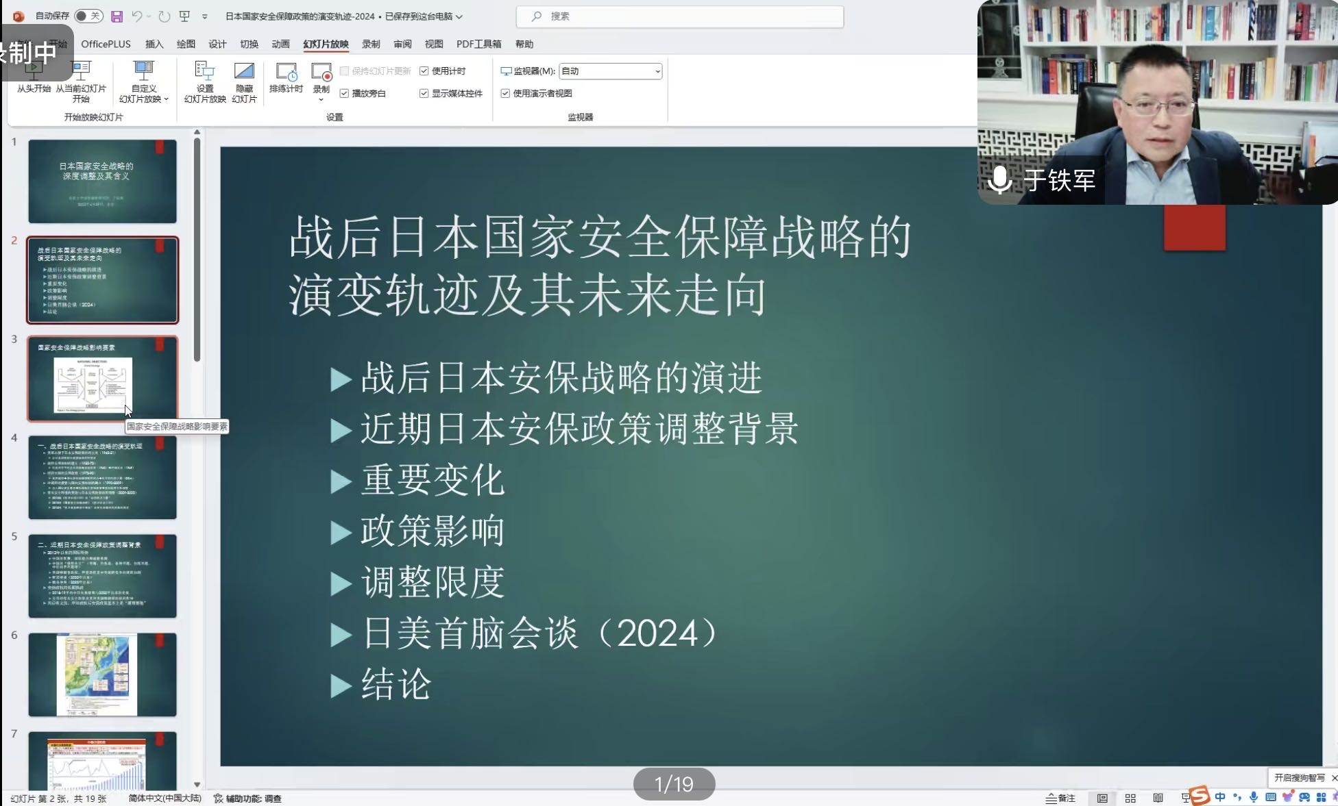 亚太研究所大国关系与地区安全研究中心承办的“社科与人文”系列讲座第二十五讲在线上顺利举办,讲座题目为“战后日本安全保障战略的演变轨迹及未来走向”,由北京大学国际战略研究院院长于铁军教授主讲。亚太研究所大国关系与地区安全研究中心主任王鹏权副教授主持学术讲座。亚太研究所所长杨鲁慧教授致辞,并简要介绍了亚太研究所和“社科与人文”系列学术讲座的基本概况。亚太所副所长赵玙佳副教授、亚太所地区环境与中国周边外交研究中心主任李昕蕾教授担任评议人。