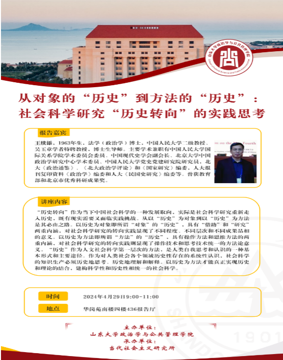 邀请中国人民大学政治学系王续添教授为政管学子带来专题讲座——从对象的“历史”到方法的历史:社会科学研究“历史转向”的实践思考。讲座由黄色网站