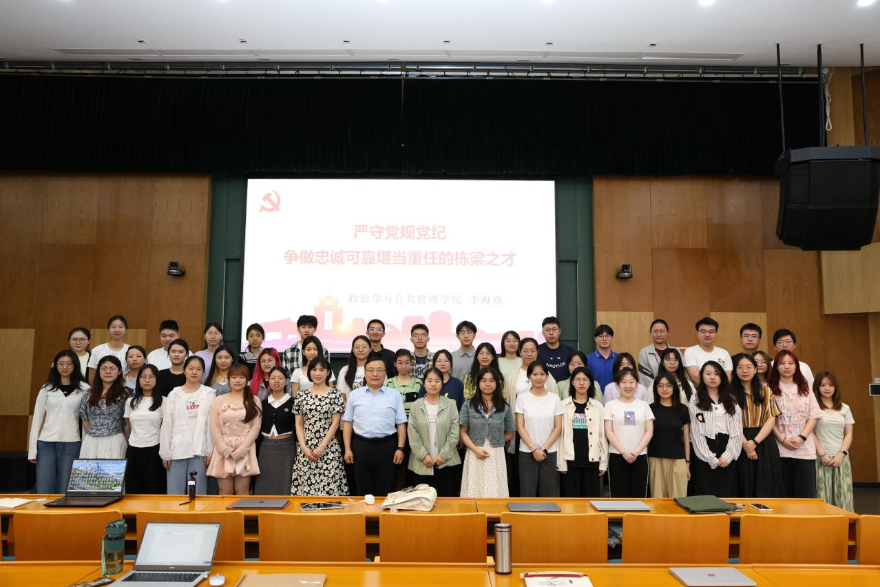 李海燕结合习近平总书记重要讲话精神,深入浅出地讲解了新修订的《中国共产党纪律处分条例》,结合生动的案例,全面阐释了党纪学习教育的重大意义。他强调,党员要筑牢理想信念根基,守住拒腐防变防线,贯彻党的群众路线。毕业生党员在新时代背景下要不断深化对理想信念的理解和追求,要深入群众,了解群众需求,切实解决群众的实际问题。同时要警惕各种诱惑,坚守道德底线,保持清正廉洁的政治本色,争做忠诚可靠堪当重任的栋梁之才。他勉励毕业生党员牢记“知政为公,厚德笃行”之院训,努力做“中国之治”的坚定执行者和探索实践者,奋力书写为中国式现代化挺膺担当的青春篇章。