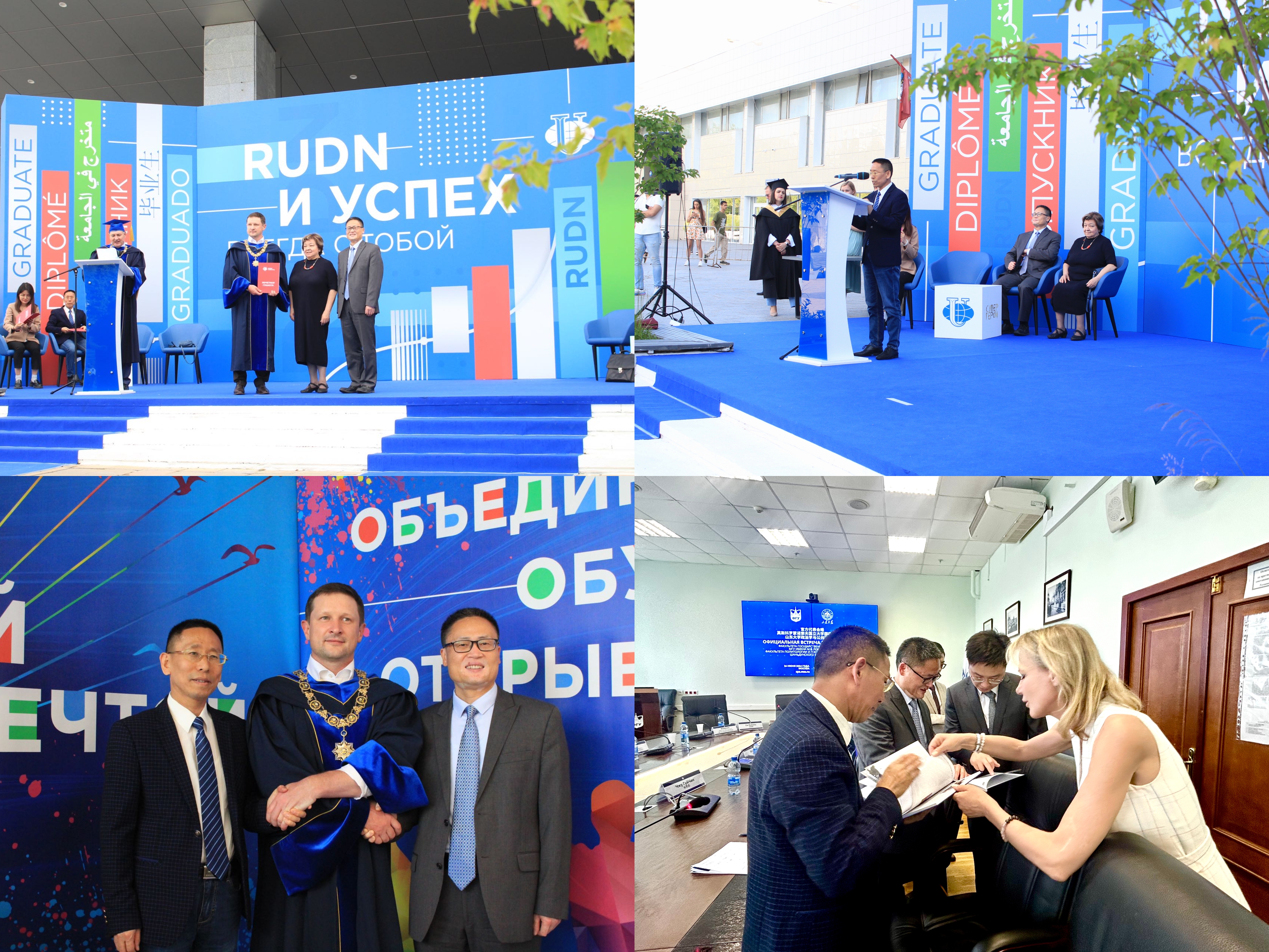马风书教授、黄登学教授颁发了荣誉证书,表彰他们对两校学生联合培养项目等所做出的突出贡献,黄登学致辞表示感谢。随后,朱贵昌与俄罗斯人民友谊大学校领导共同为两校联合培养的5名毕业生颁发了学位证书。