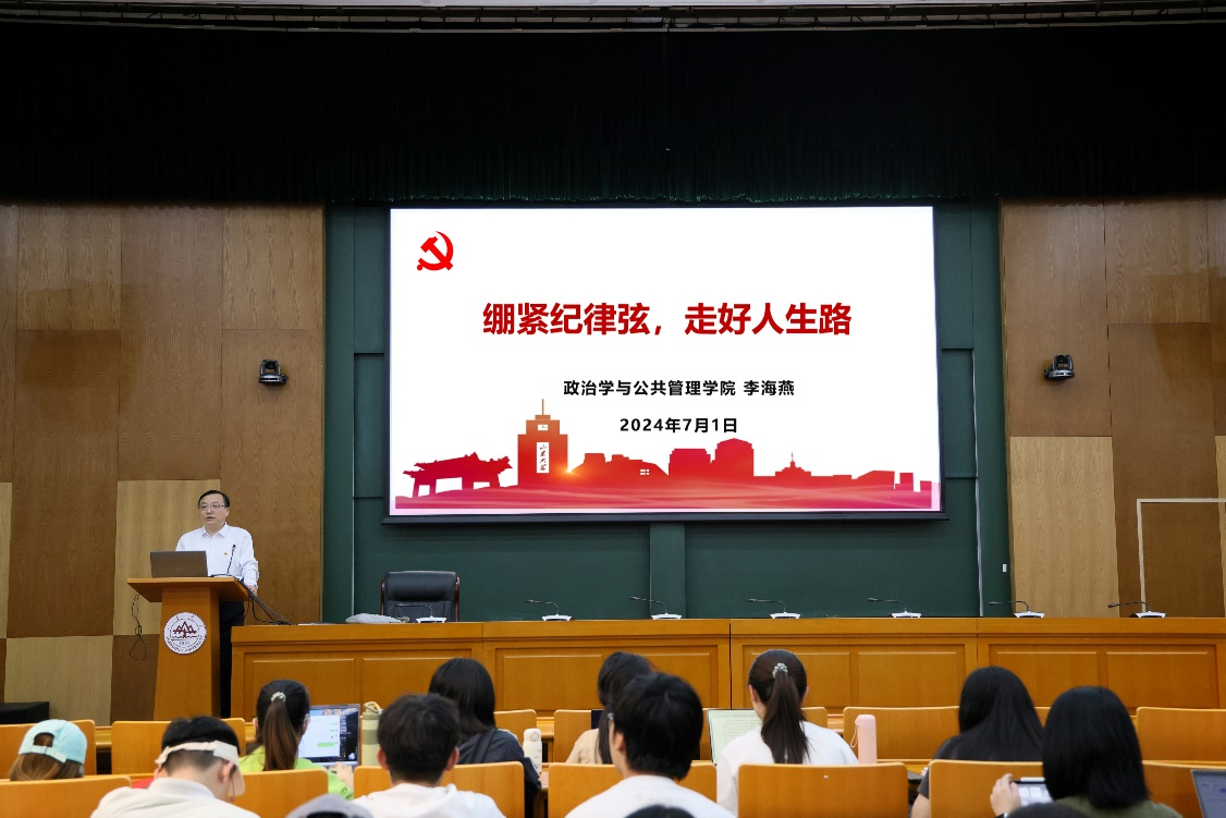党委书记李海燕以“绷紧纪律弦,走好人生路” 为题讲授专题党课,结合习近平总书记重要讲话精神,讲解了新修订的《中国共产党纪律处分条例》,全面阐释了党纪学习教育的重大意义。勉励党员牢记“知政为公,厚德笃行”之院训,努力做“中国之治”的坚定执行者和探索实践者,奋力书写为中国式现代化挺膺担当的青春篇章。