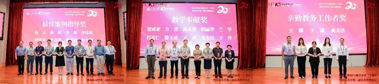 MPA教育事业中做出突出贡献的教育工作者,大会举行隆重的颁奖仪式。刘玉安教授、孔令栋教授、曹现强教授荣获“特殊贡献奖”,楚成亚、方雷、高永贵等教师获得“教学奉献奖”,杨志、黄晴、李振等教师获得“最佳案例指导奖”,王娜、王深、曲美洁等教师获得“辛勤教务工作者奖”,樊丽明等领导嘉宾为各位老师颁发奖牌。