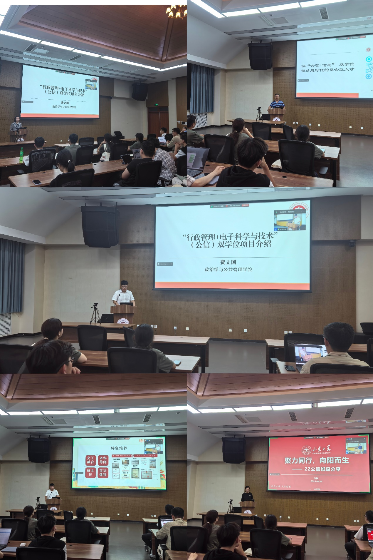 为公信班提供的最优质的师资力量和富有特色的人才培养模式。紧接着,费立国老师对公信班的基本情况进行了全面讲解,细致梳理了其招生信息、设置背景、专业定位、培养特色、核心课程、就业面向及人才培养现状。之后,栗华老师从“做信息时代的复合型人才”出发,从专业设置目的、课程安排思路和实训课程的实践意义等方面,深入讲解了公信双学位培养方案及教学计划,在强调其“小班制教学”培养特色的同时分析了公信班未来升学及就业方向。随后,公信班学生代表就公信班取得的成就、学习活动氛围及专业个性化培养模式等方面进行了分享。