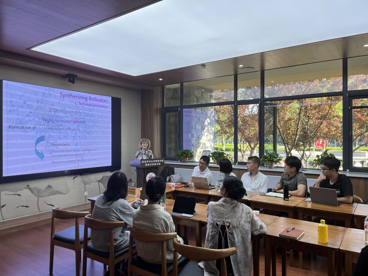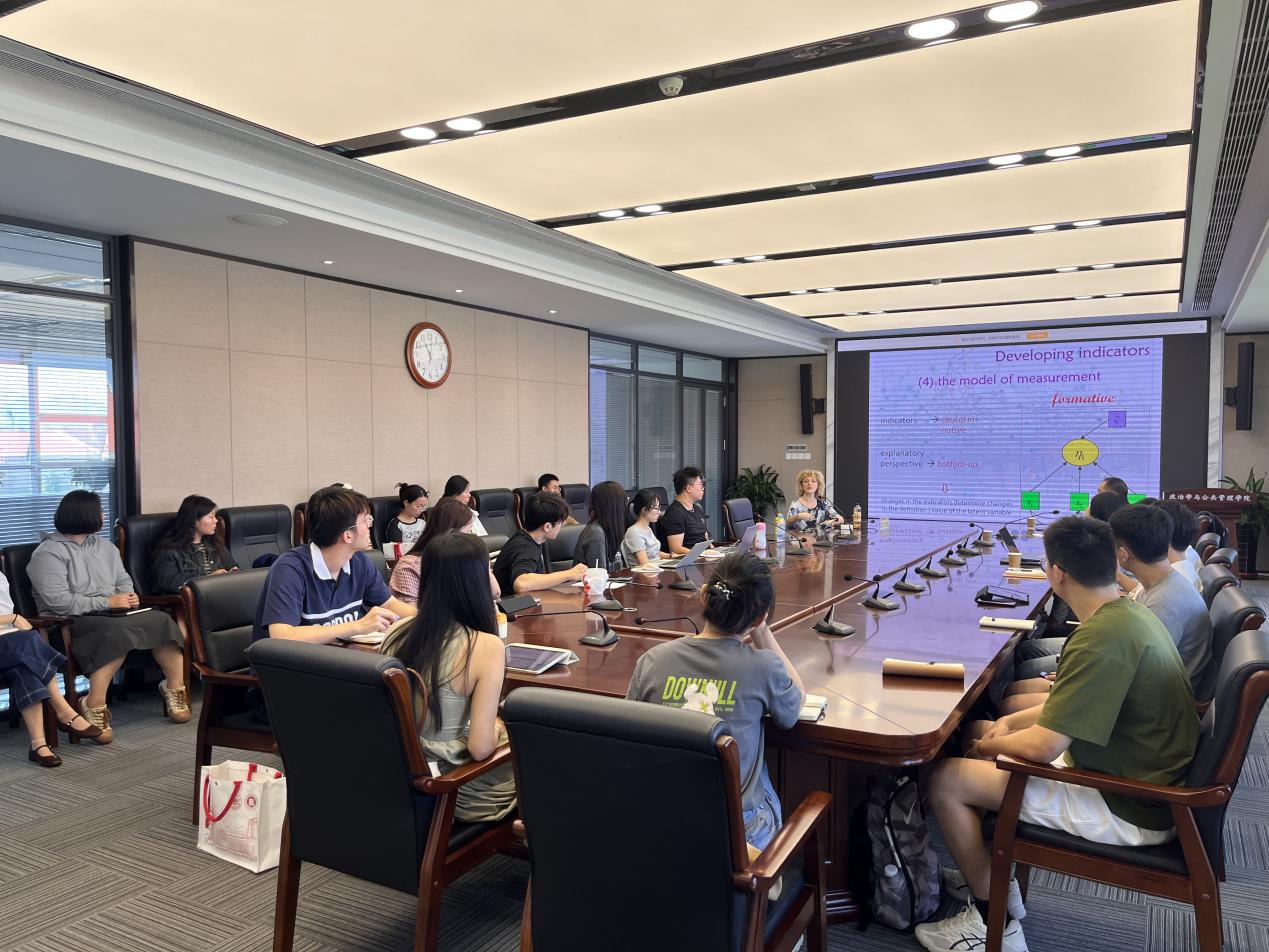 相关专业博士生、硕士生讲授了《社会调查研究中的主观测量》、《生活质量研究的核心理论、问题与进展》的等系列课程。她分别基于当前国际生活质量研究和社会调查研究领域的前沿理论、方法和技术,结合自身以及研究团队的新近研究成果,就社会调查研究中的主观测量理论与方法问题、生活质量评价研究的理论与方法问题以及相关前沿发展等开展了讲授。在互动环节,选课研究生就主观测量的指标设计、统计模型选择以及数字时代的城市生活质量研究进展等问题与Filomena教授进行了深入交流,Filomena教授强调要高度重视测量的信效度问题以及合适统计模型的选择,并结合多年来基于欧洲统计指标开展的生活质量相关研究及意大利多个城市研究案例进行了研究分享,现场气氛热烈。