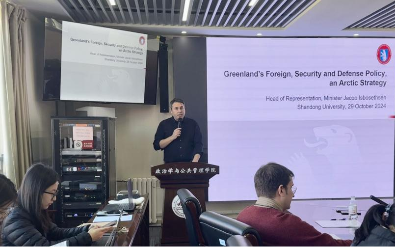讲座伊始,Jacob Isbosethsen详细介绍了格陵兰的概况。作为世界上最大的岛屿,格陵兰拥有丰富的自然资源、独特的文化遗产和独具特色的政治发展历程。随后,Jacob Isbosethsen分享了格陵兰的外交与安全政策,着重强调格陵兰在北极地区的重要地位以及其在国际合作中的积极态度,并指明格陵兰北极战略的核心内容,包括加强与其他北极国家的合作、建设北极航道等基础设施、推动北极地区的可持续发展以及维护北极地区的和平与安全。最后,Jacob Isbosethsen通过分享格陵兰在应对气候变化、保护生态环境以及发展绿色能源等的成功案例,为中国与格陵兰在北极地区开展合作提供了宝贵经验。