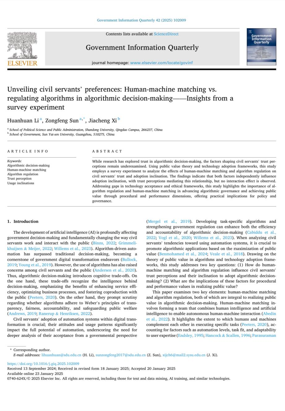 李欢欢助理研究员(第一作者)与孙宗锋教授(通讯作者),共同在数字政府国际顶刊Government Information Quarterly发表论文标题为“Unveiling Civil Servants' Preferences: Human-Machine Matching vs. Regulating Algorithms in Algorithmic Decision-Making——Insights from a Survey Experiment”的学术论文。Government Information Quarterly是国际信息管理与数字政府领域的SSCI顶级期刊,由Elsevier出版社出版,影响因子为7.8。