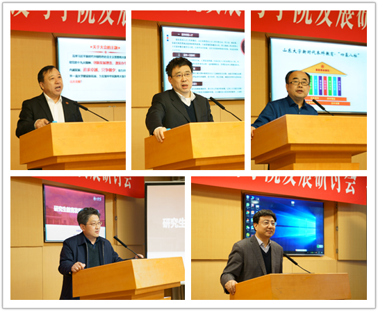双一流大学建设过程中的重要性体现得越来越明显,并从学位授权点现代化工程建设、学科交叉研究生培养实施办法、研究生教育综合改革方案修订情况等方面系统介绍了学校研究生教育的改革创新举措。邢占军以规划、协同、谋大事、干大事、成大事、交叉为关键词,指出哲学社会科学研究要瞄准国家战略和重大需求,并以“构建中国特色哲学社会科学的山大学派”为目标,从科研组织、学术活跃、评价激励等方面介绍了学校社科管理服务的改革创新。五位报告人的报告视野开阔、内容充实、针对性强、富有启发,受到与会老师的高度评价。