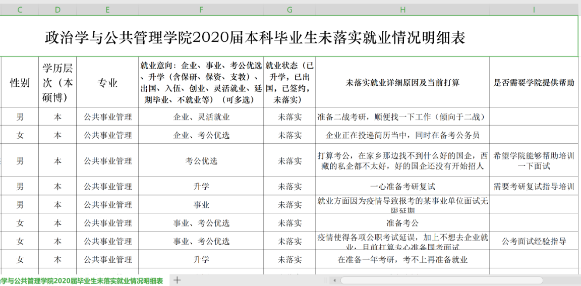 深入调查,建立一类一策指导台账。积极引导每一位本科毕业生认认清当前就业形势、转变求职方式、积极主动地应对在新冠肺炎疫情影响下的求职工作。安排班委详细了解每一位未落实就业的毕业生情况,深入调查学生未就业的原因、当前的就业意向以及需要黄色网站
