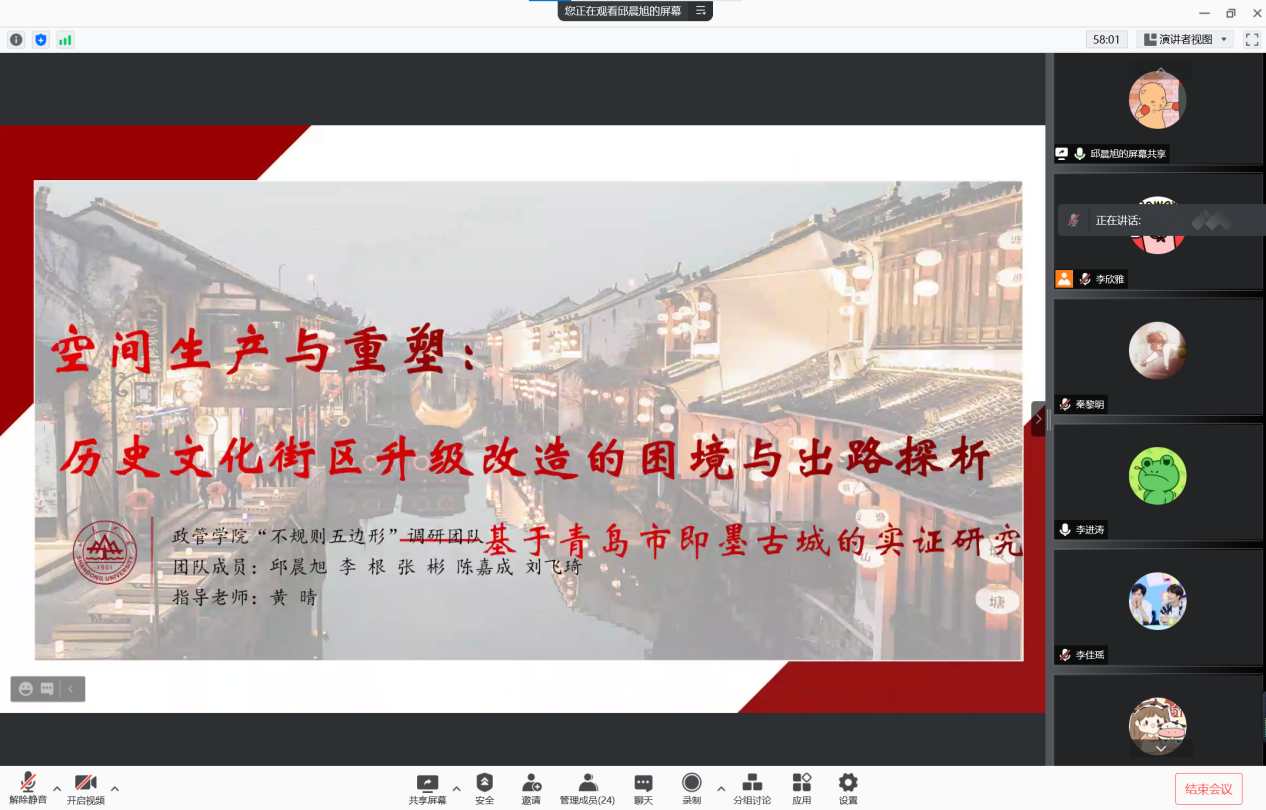 他们深入社会实际,了解社会现状,在探索过程中不断提高自身综合能力,并用自己的所学所知践行政管学子的责任与担当。随后,评委老师指出各队仍需改进之处及如何进一步完善实践,从报告的撰写、选题的现实意义、研究分析的深入性、对策建议的可推广性等方面给予其悉心指导,为同学们指点迷津。